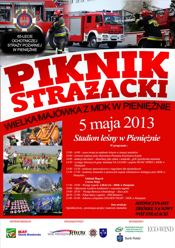 5. maja na stadionie leśnym w Pieniężnie odbędzie się "Wielka Majówka" połączona z piknikiem strażackim zorganizowanym z okazji  65. lecia istnienia OSP w Pieniężnie. Impreza rozpoczyna się mszą świętą na stadionie o godzinie 13:00. Serdecznie zapraszamy